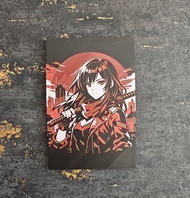 Dies ist Ayame. Sie ist keine gewöhnliche Figur, sondern eine Wächterin in einer Welt, die von Silikon und Stahl geformt wurde. Die stilisierte Silhouette der Cyberpunk-Dystopie im Hintergrund ist ihre Heimat, ein Labyrinth aus Schatten und Neonlicht. Der massive rote Mond ist ein Symbol für eine vergessene Energiequelle, die nur wenige zu bändigen wissen. Ayame blickt entschlossen in die Zukunft, ihr Katana auf dem Rücken, bereit, das zu verteidigen, was in dieser rohen Umgebung noch Wert hat. Ihre Lederjacke und das rote Halstuch sind keine Mode, sondern Rüstung und Erkennungszeichen zugleich.